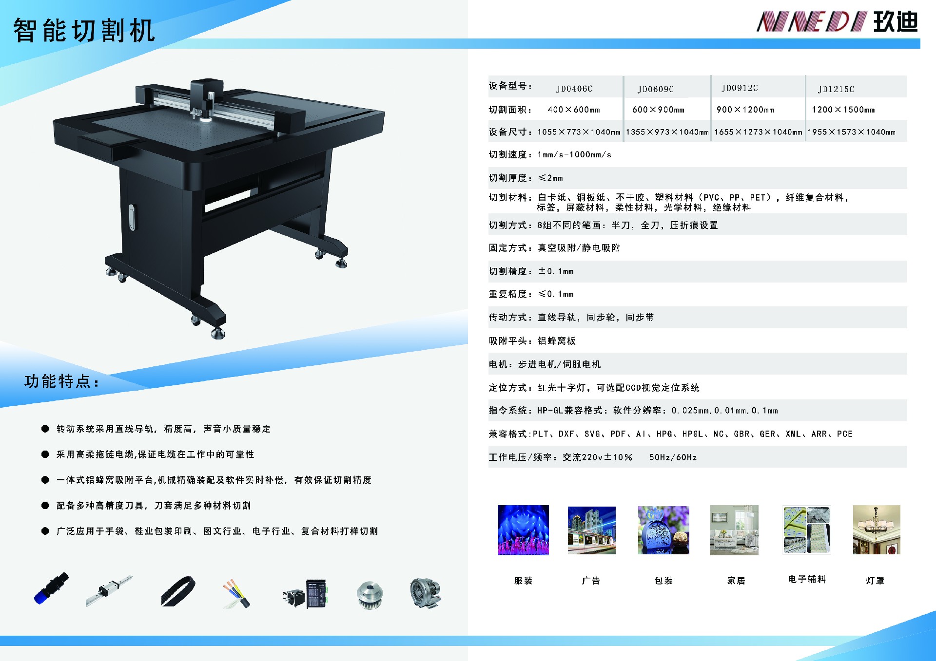 玖迪科技專業從事cad/cam及工程數據庫開發應用、集產品研發製造、產品銷售和服務為一體的高科技數控切割機設備企業。為服裝、製鞋、箱包手袋、家私、汽車內飾、複合材料、紙箱紙盒、廣告印刷等行業提供智能裁切解決方案